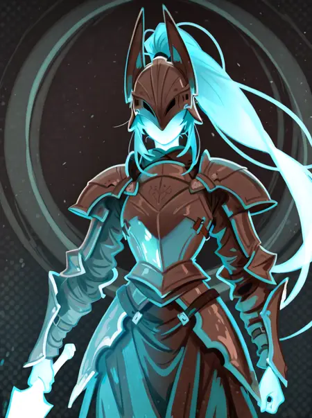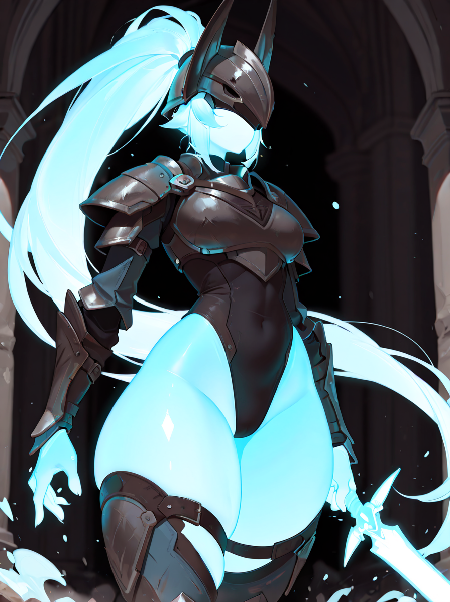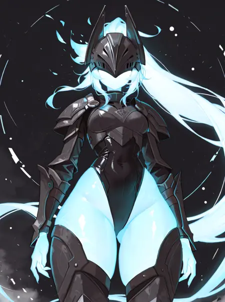 Triggers: humanoid, faceless, mouthless, eyeless, long hair, ponytail, helmet, blue body, glowing body, armor