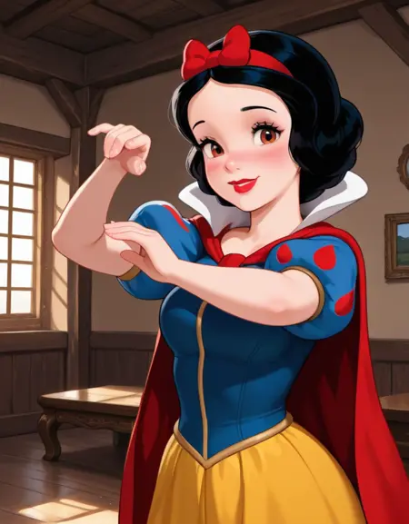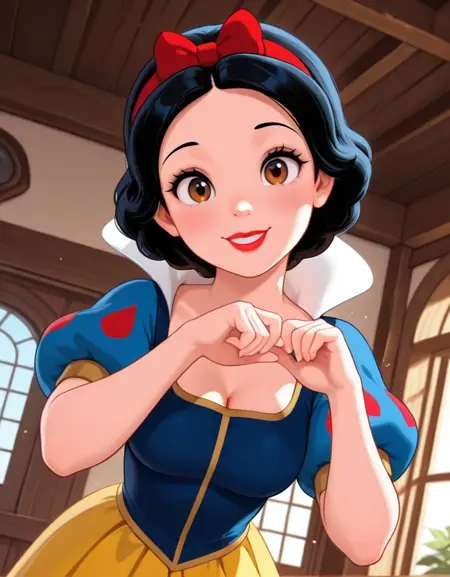 snowwhitexd, 1girl, solo, medium breasts, short hair, black hair, lips, red lips, smile, blue shirt, puffy sleeves, short sleeves, yellow skirt, red hairbow, blush