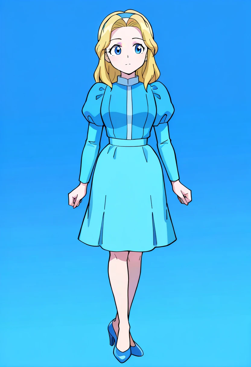 MariaRobotnik, 1girl, blue dress, long sleeves, light blue skirt, blue headband, blue high heels, blonde hair, blue eyes,