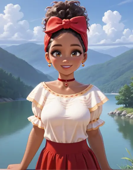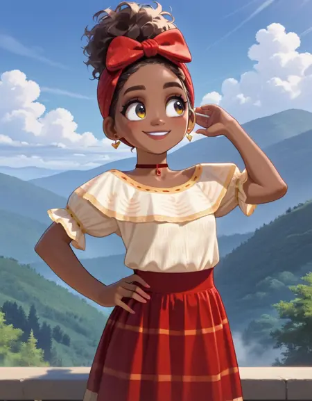 暗めの肌の女性、茶色の目、黒髪、チョーカー、赤いリボン、髪のリボン、