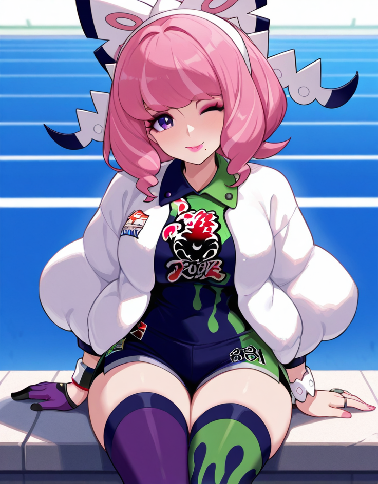 분홍색 머리카락, 입 밑 점, 앞머리, 단발, 리본, 보라색 눈, 분홍색 입술, 분홍색 아이섀도우,