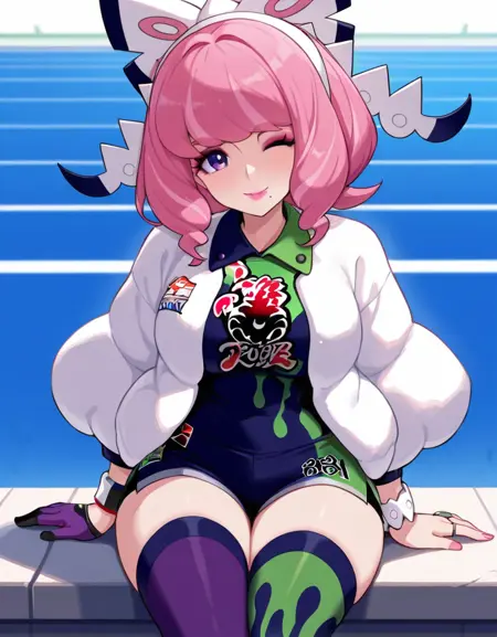 허벅지까지 오는 양말, 한 손 장갑, 장갑, 맞지 않는 하의, 비대칭 하의, 반바지, 흰색 자켓, 셔츠, 신발, 팔찌, 칼라 셔츠, 보석, 손가락 일부가 드러난 장갑, 음영 처리된 얼굴, 벌어진 입, 다이내맥스 밴드,
