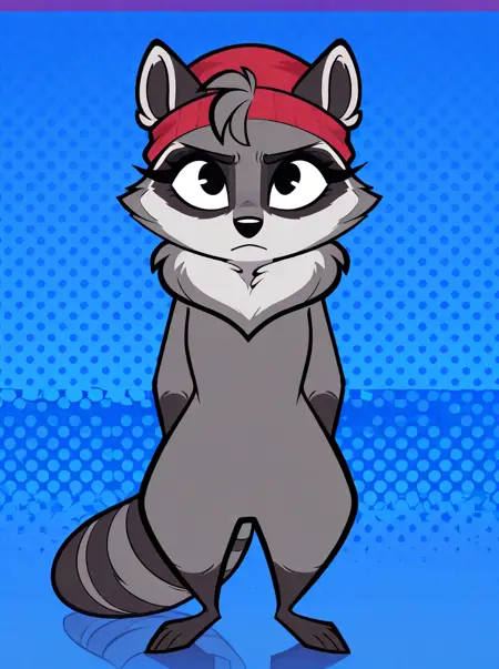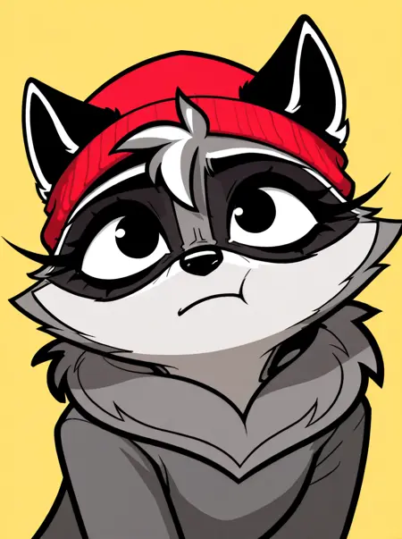 トリガー: アライグマ、女性、アンスロ、赤いニット帽、灰色の体、頬の毛束、長いまつげ、首の毛束