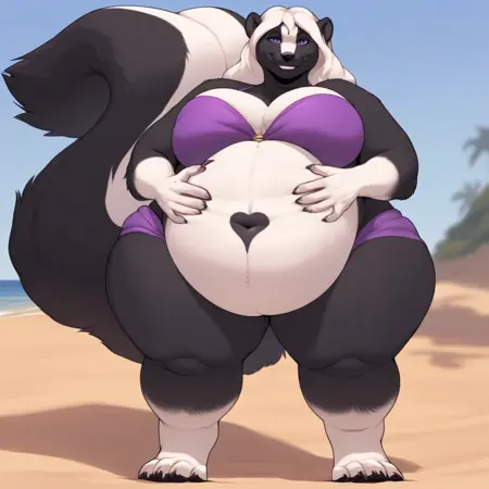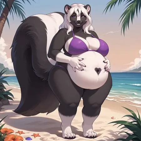 skunk, skunk girl, black and white fur, white hair, long hair, purple eyes, black nose, skunk ears, claws, large tail, skunk tail, chubby, large breasts, fat, thick thighs, wide hips,