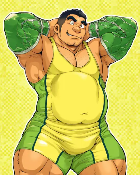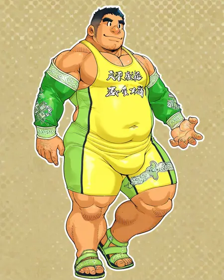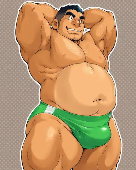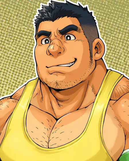 トリガーワード: avarga_housamo_ill、黒髪、丸い目、あごのくぼみ、ひげ、サイドバーン、筋肉質、ぽっちゃりした体格、がっしりした体格、日焼けした肌、ふっくら、黒い瞳、