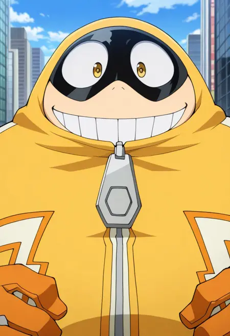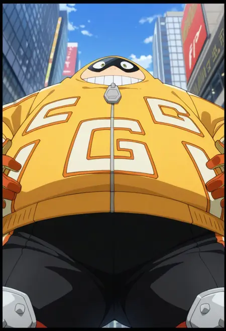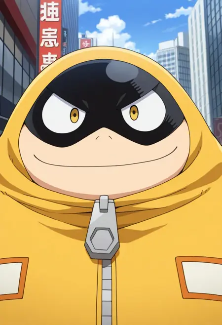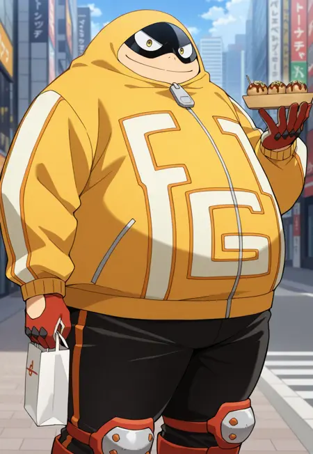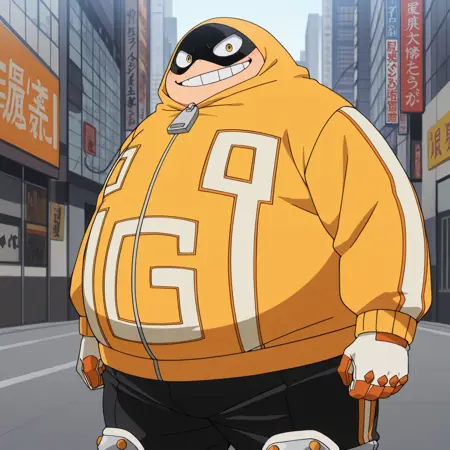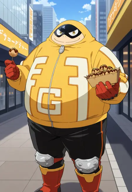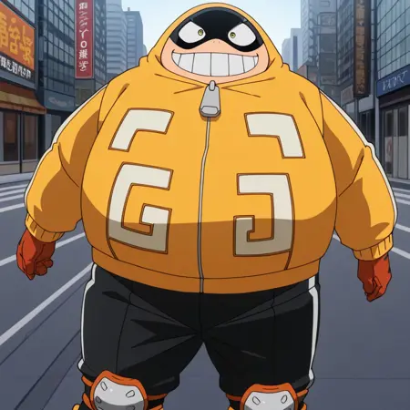 fatgum, male, overweight, black mask, yellow jacket, black track pants, boots, knee pads, gloves, hood up, yellow eyes, zipper pull tab,