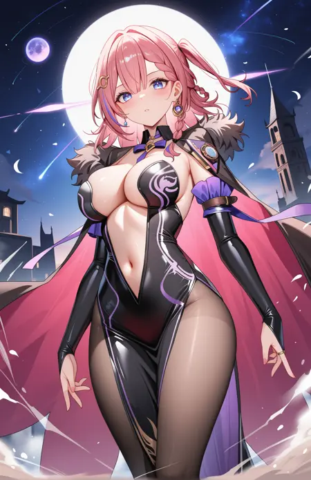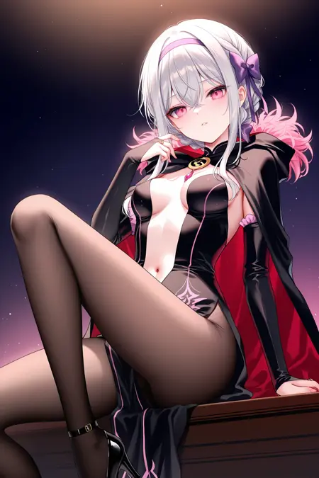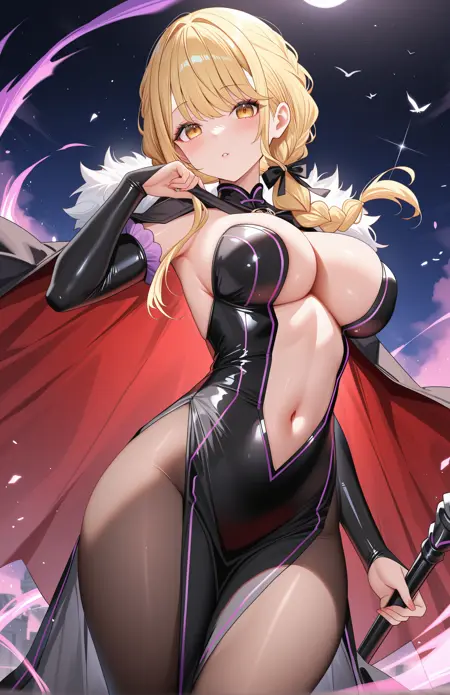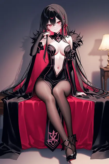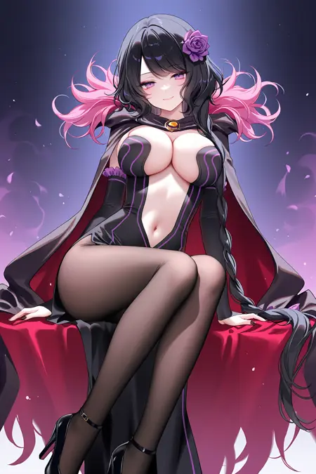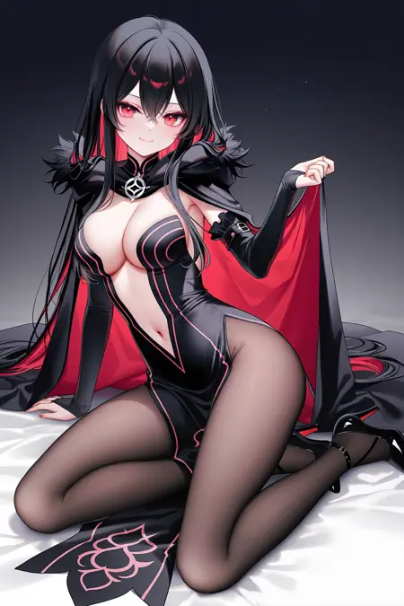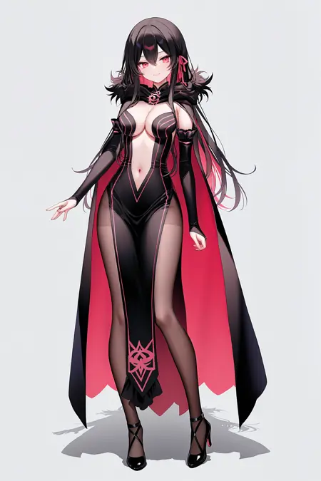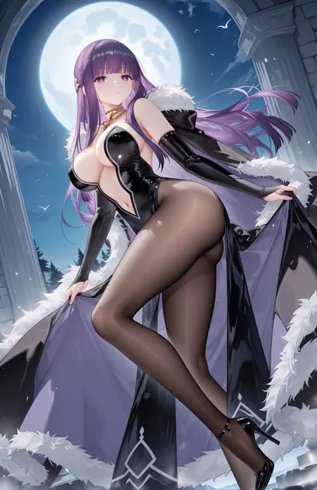 elsaoutfit,two-sided cloak,fur trim,plunging neckline,strapless dress,black dress,center opening,detached sleeves,side slit,bridal gauntlets,brown pantyhose,high heels,