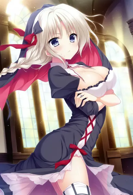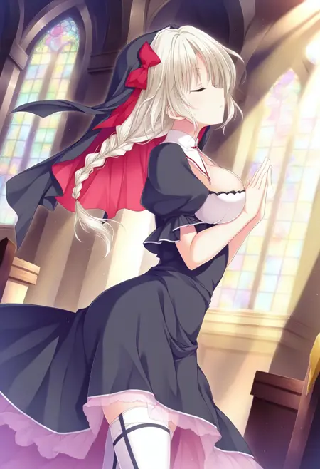 トリガーワード: c-suu、プラチナブロンドの髪、青い瞳、長い髪、片側の編み込み、髪飾り、ベール、
