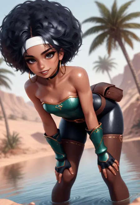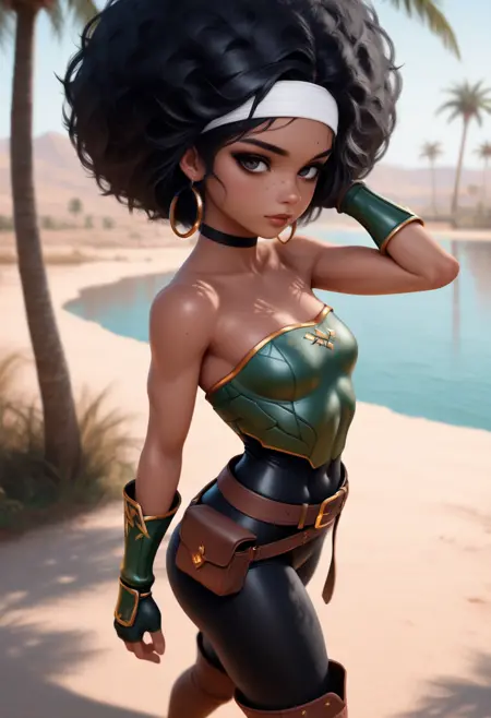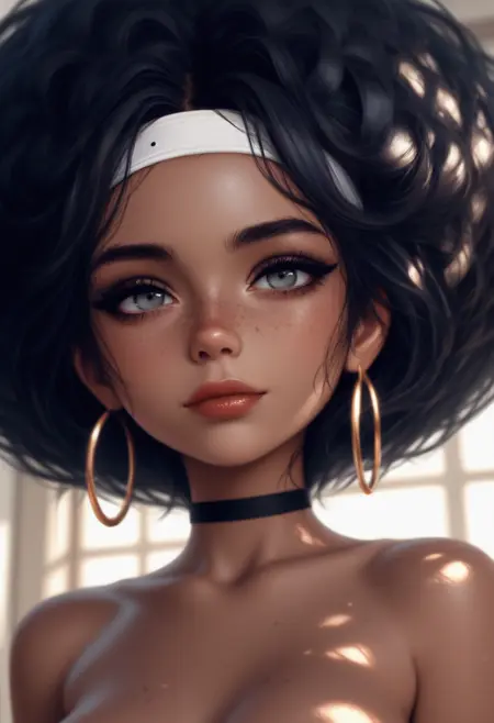 Kaia – Reddish Brown Skin, Smokey black eyes, Dark brown lips, Freckles, Huge Afro, Toned body, Small breasts, Natural fingernails,