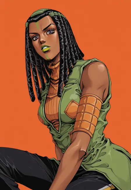 Ermes Costello, dark-skinned girl, black hair, dreadlocks, hair pieces, face markings, gray eyes, green lipstick, orange sweater, green jacket, sleeveless, armbands, dark pants, brown shoes