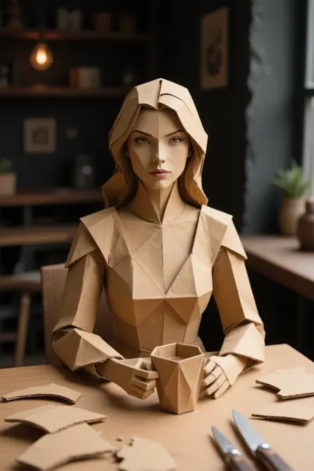트리거 단어: papercut, papercraft aesthetic, low-poly, Sharp edges, visible fold lines, polygonal planes, natural cardboard color, shadows define form