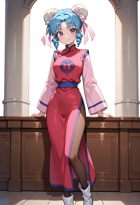 bun cover, pink hair bow, china dress, long sleeves, wide sleeves, side slit, brown pantyhose, white boots