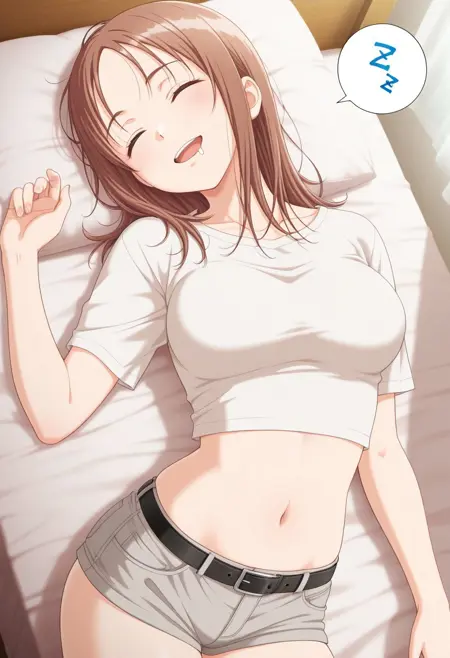 3. crop top,white crop top,short sleeves,midriff,navel,belt,black belt,shorts,grey shorts,short shorts