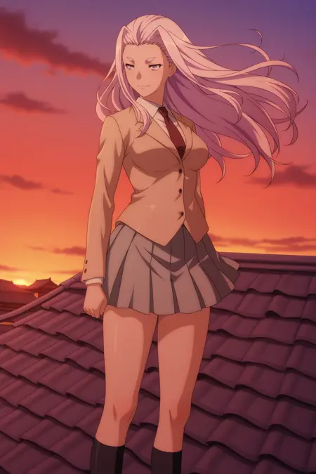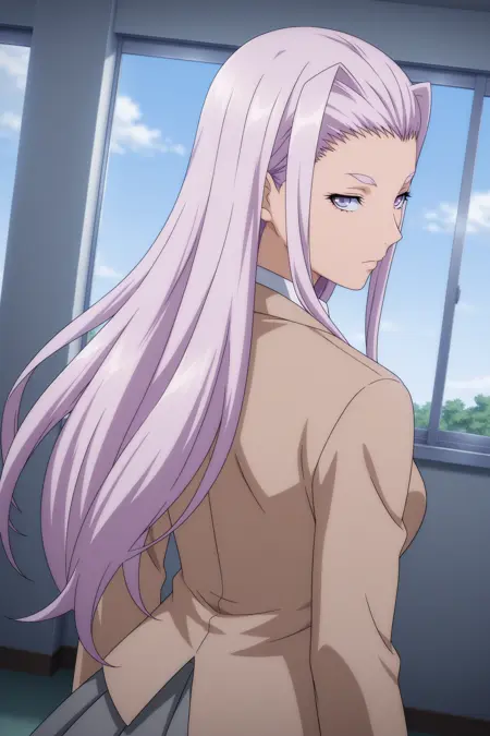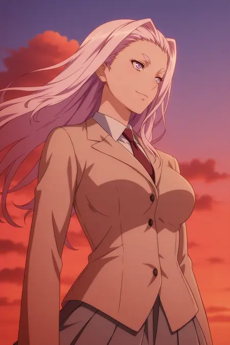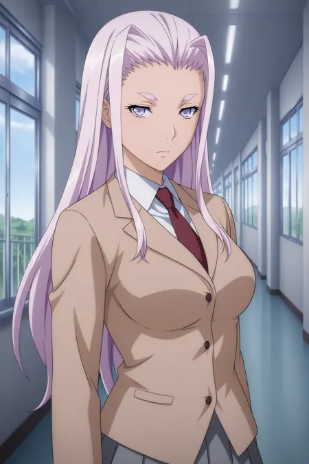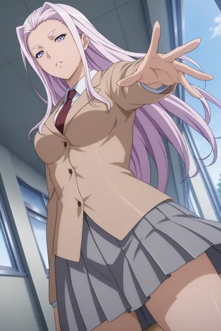 himiko, long hair, purple hair, sidelocks, curtained hair, purple eyes, long sleeves, brown jacket, white shirt, collared shirt, red necktie, grey skirt, pleated skirt, black socks, kneehighs, brown footwear, loafers