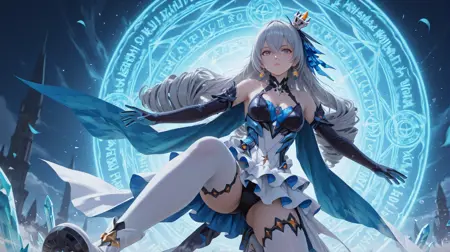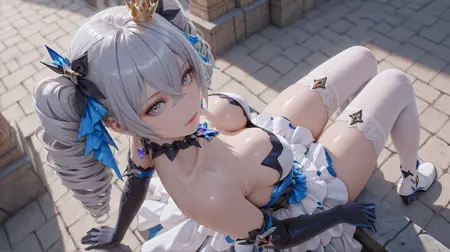 Bronya01,1girl,bronya zaychik,grey hair,solo,drill hair,long hair,thighhighs,gloves,jewelry,earrings,grey eyes,dress,white thighhighs,twin drills,elbow gloves,white footwear,bare shoulders,crossed bangs,hair ornament,black gloves,crown,boots,hair between eyes,emotionless,