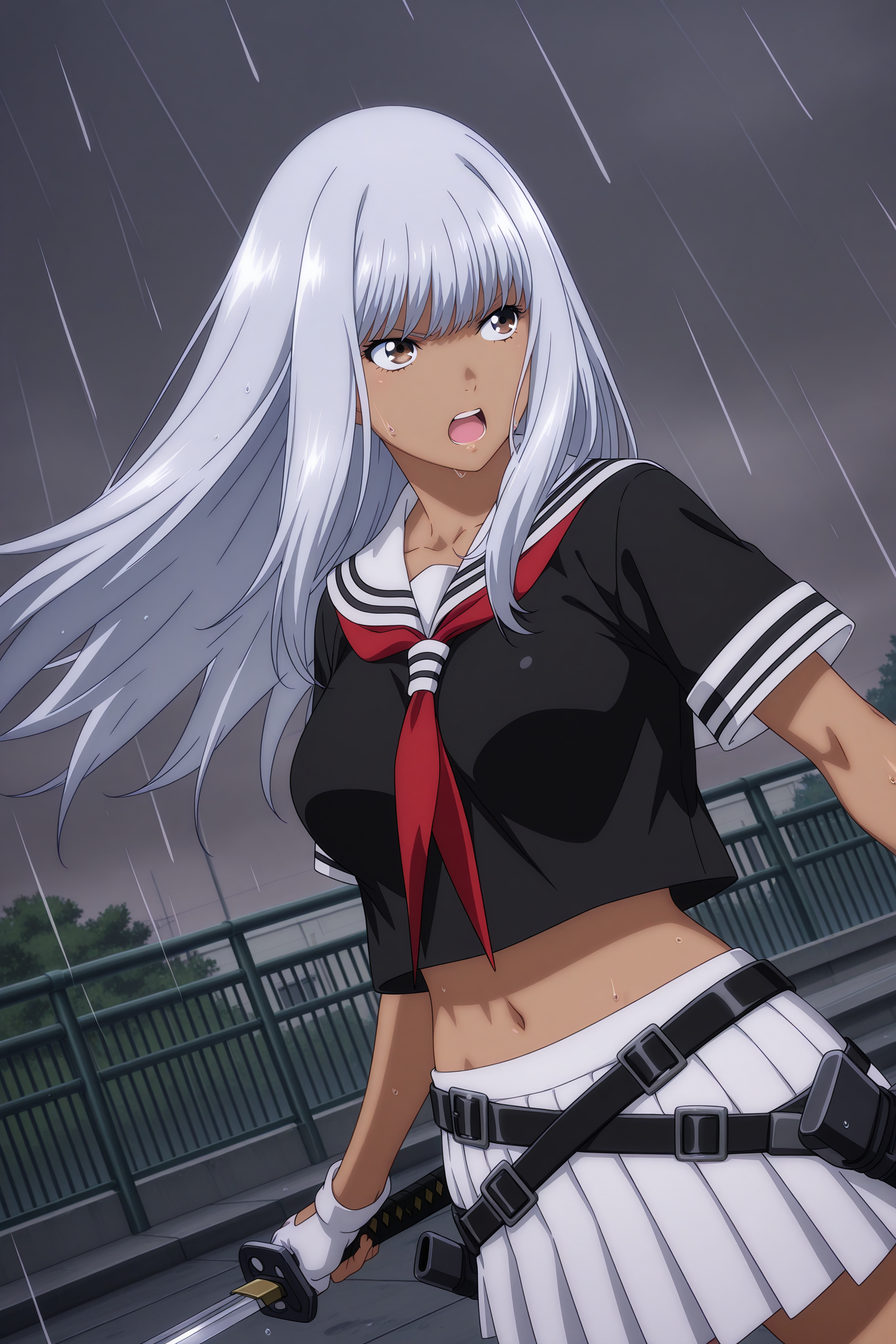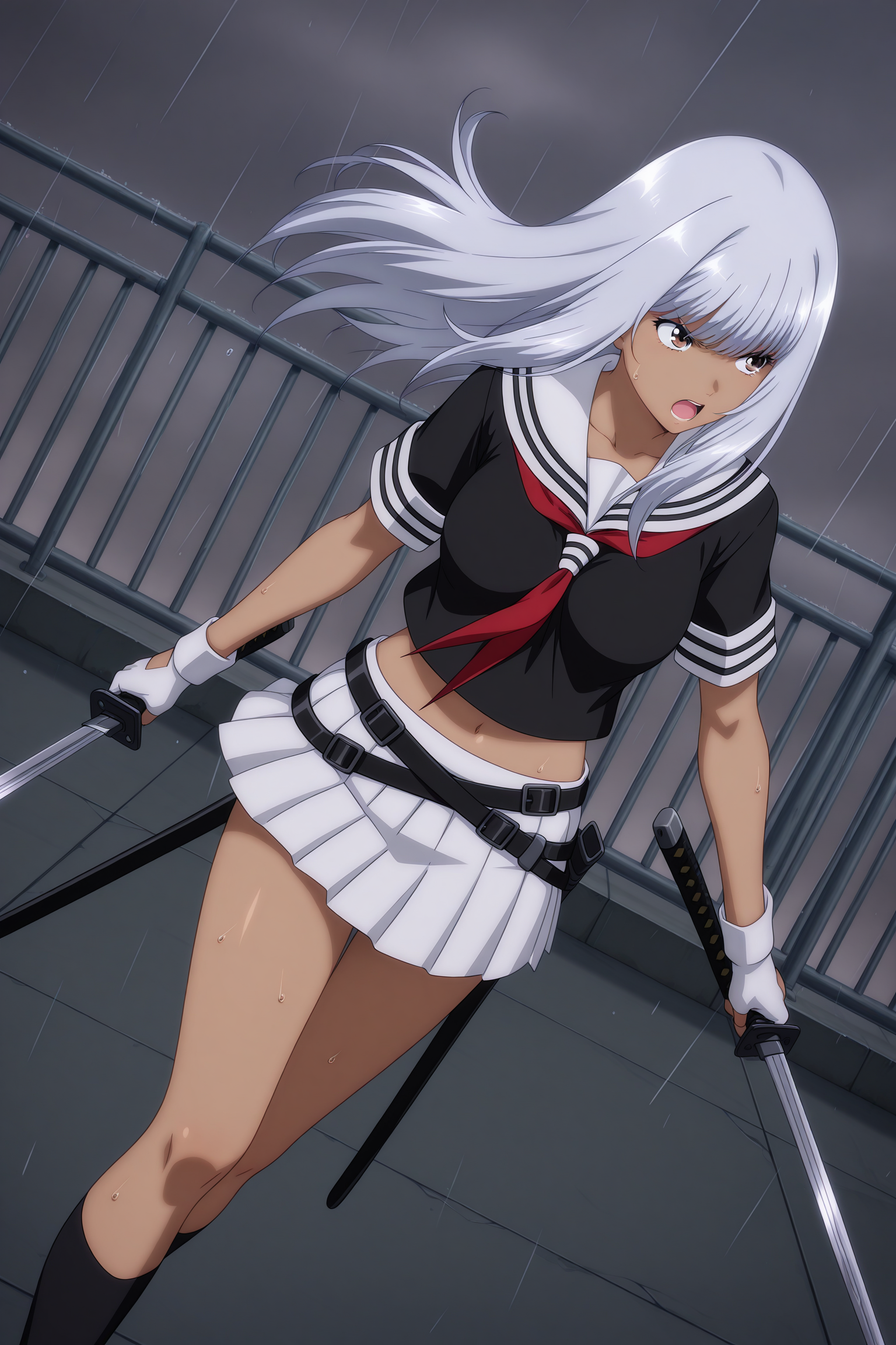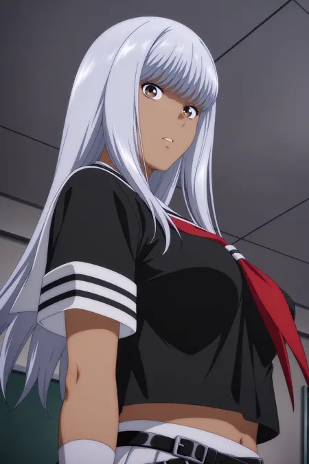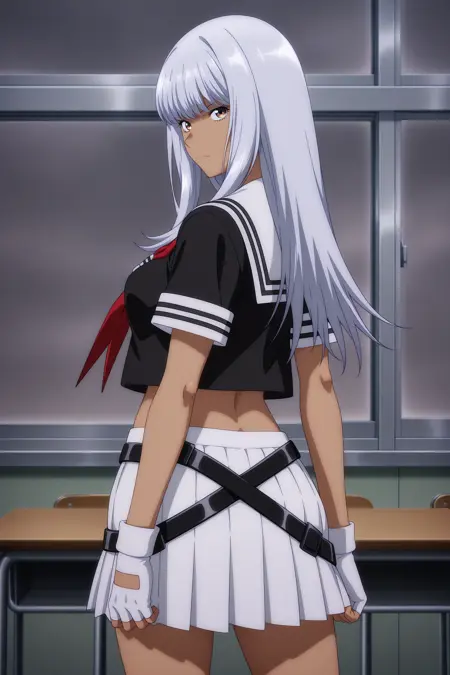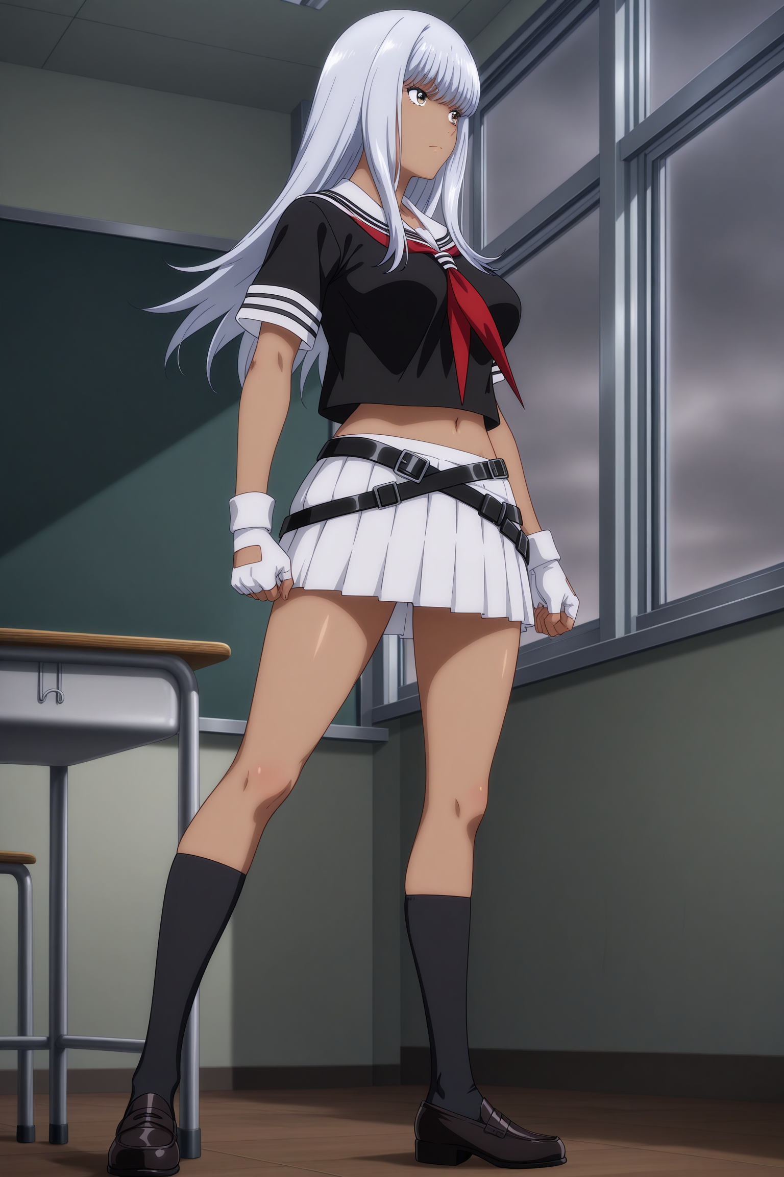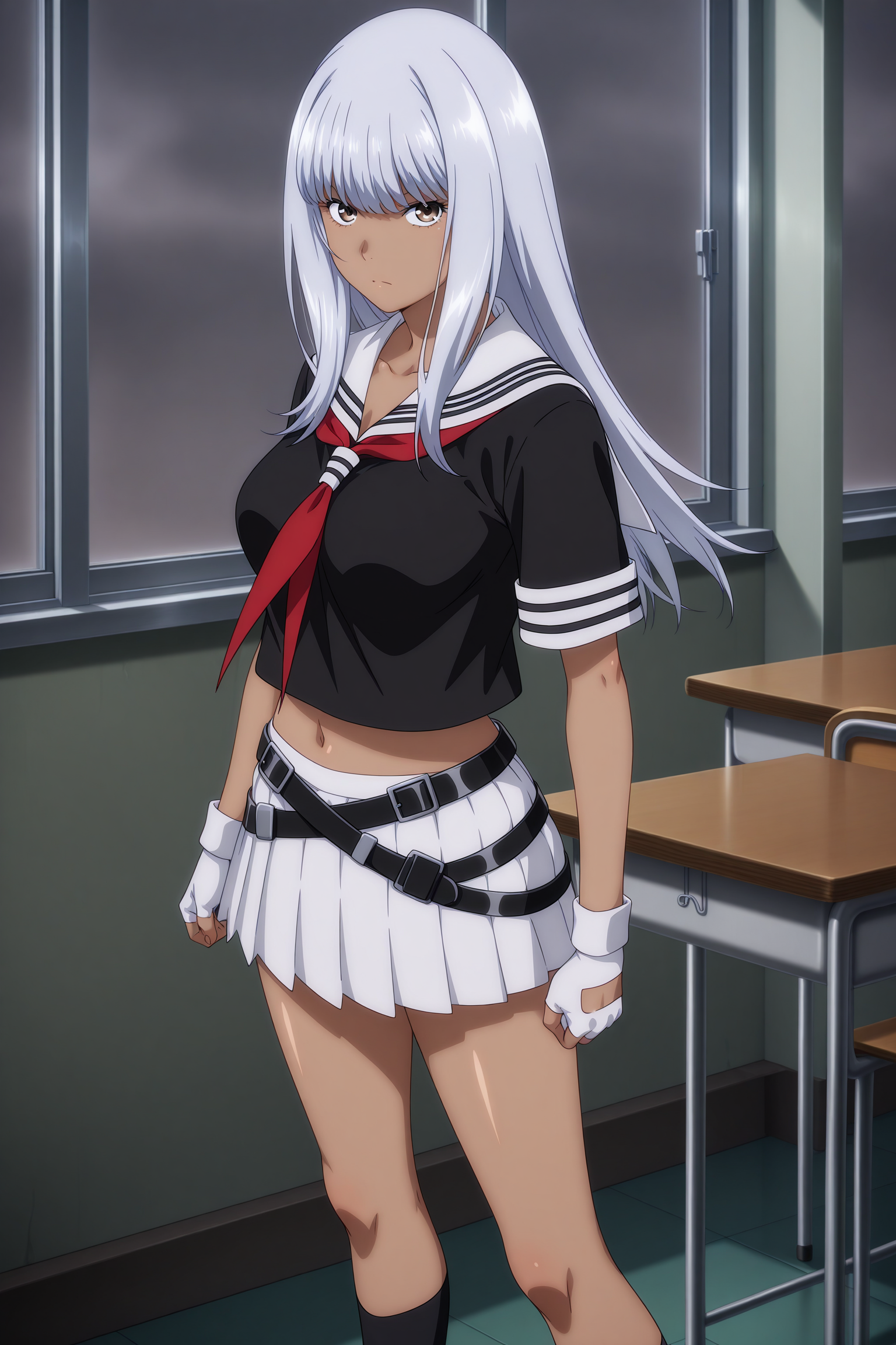 yamada asaemon, 长发, 灰发, 侧发, 飘逸的刘海, 棕色眼睛, 深色皮肤女性, 短袖, 黑色上衣, 白色水手领, 红色领巾, 短款上衣, 白色手套, 露指手套, 多条腰带, 交叉腰带, 白色裙子, 百褶裙, 黑色袜子, 过膝袜, 黑色鞋履, 乐福鞋,