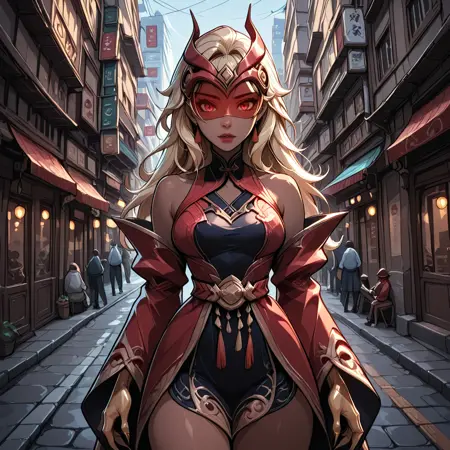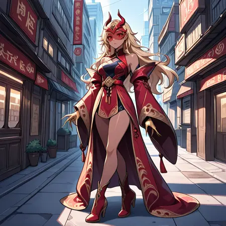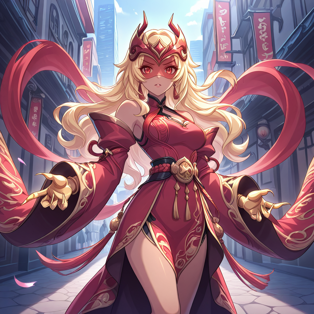 switchis,深色皮肤,中式服装,红色连衣裙,黑色连衣裙,长袖,露肩,金发,长发,尖锐的指甲,长指甲,头盔,面罩,高跟鞋,腰带,金色双手,靴子, oversized sleeve,