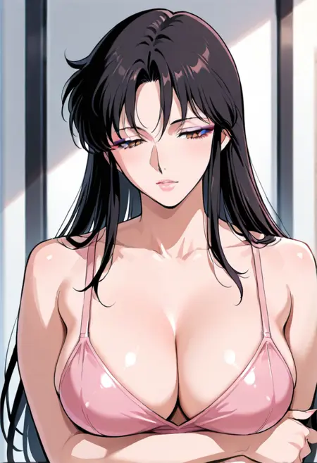kisugi hitomi, brown eyes, black hair, long hair, pink leotard, eyeshadow, lips