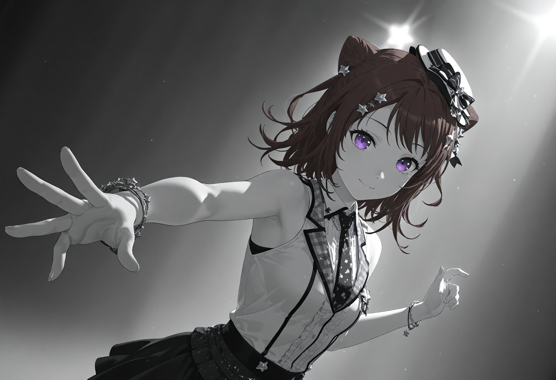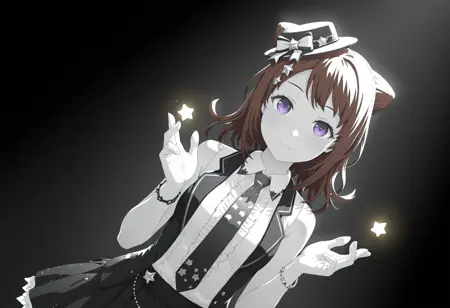 オプションの衣服タグ: belt,black shorts,black skirt,black socks,boots,bow,bracelet,frills,hat,hat bow,high heels,kneehighs,necktie,parody,red footwear,shorts,skirt,sleeveless shirt,socks,star hair ornament,star print,suspenders,white headwear,white shirt