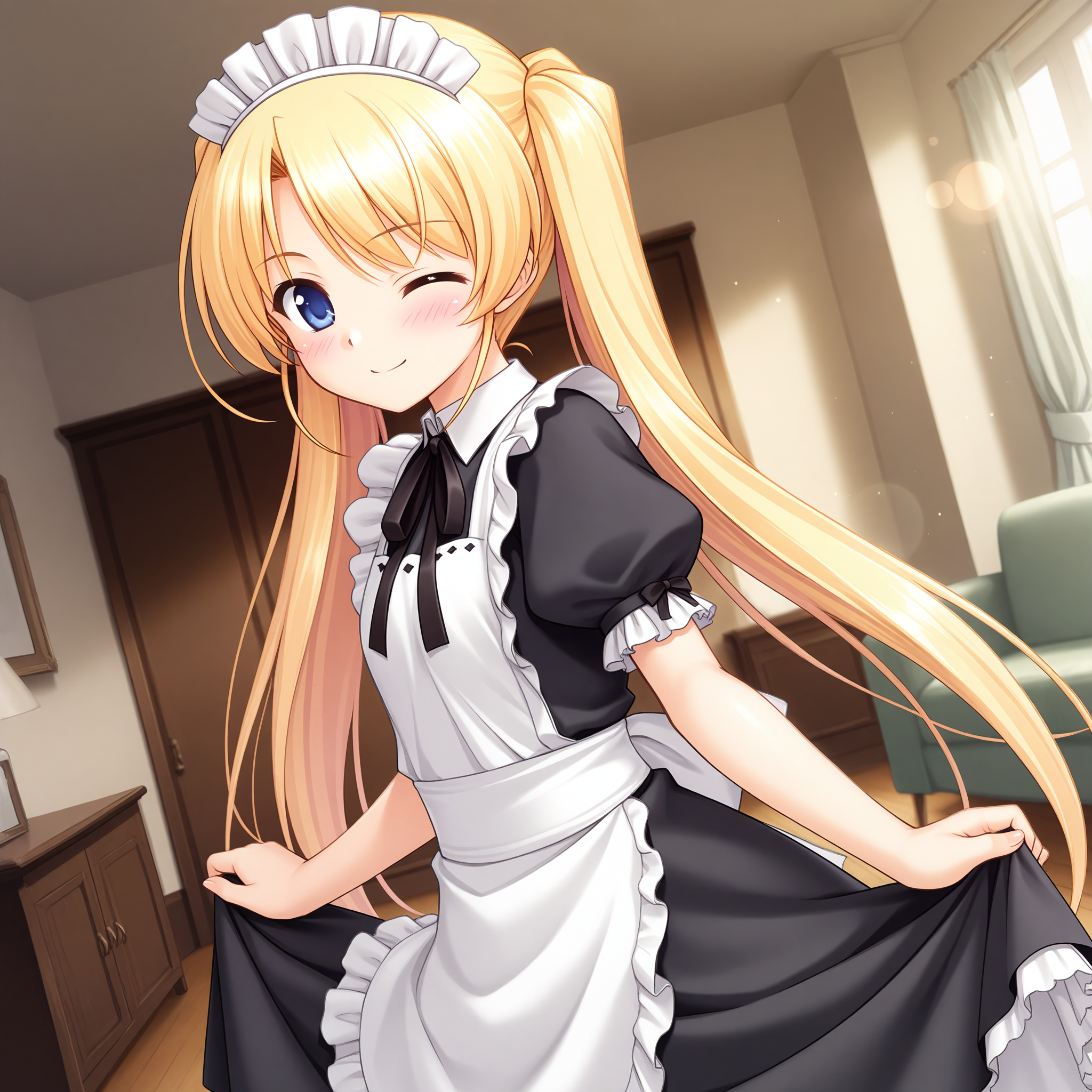 maid,maid headdress,white apron,puffy short sleeves,neck ribbon,black ribbon,white collar,black dress,frilled sleeves,