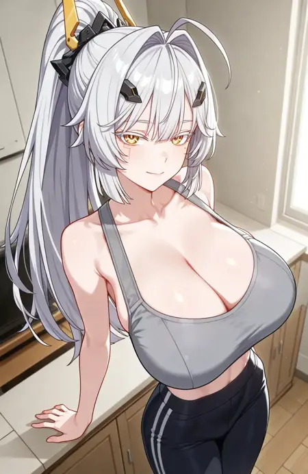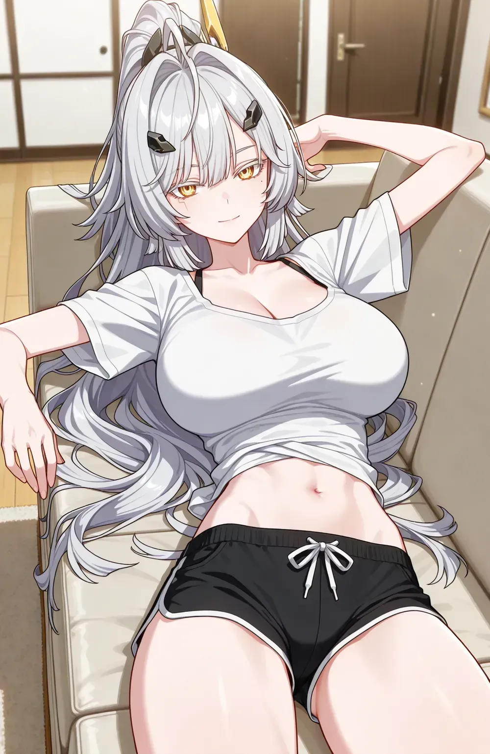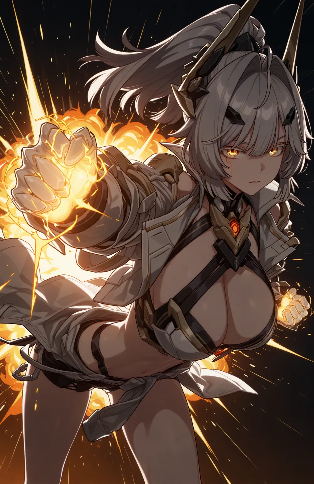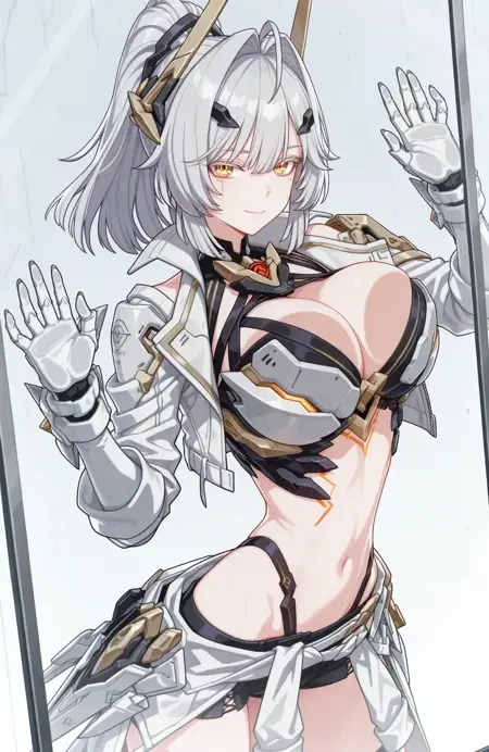 1girl, silver hair, yellow eyes, high ponytail, hair intakes, mechanical hair ornament, mark under eye, mark under right eye, mole under eye, mole under left eye