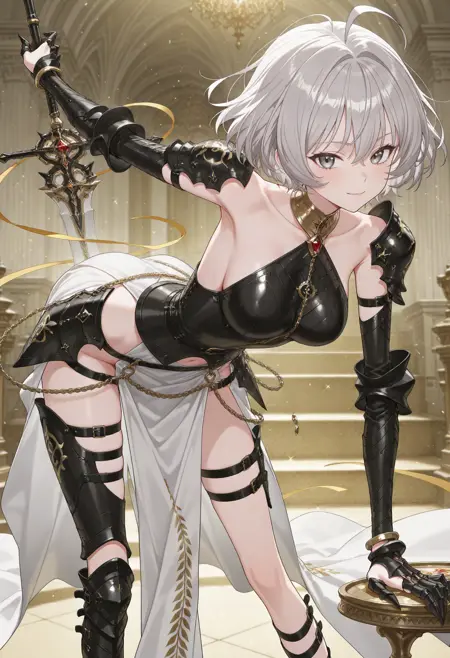 black armor, gold collar, gold_trim, gold neck armor, breastplate, gold ribbon, black finger, black_claws, black belt, no gloves, plate armor, red_gemstone, sideboob, halterneck, white pelvic_curtain