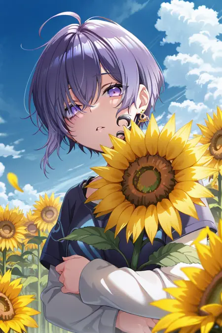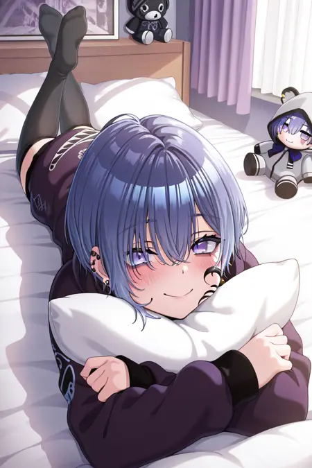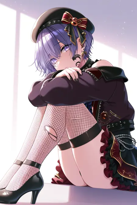 sophia, 1girl, solo, torn clothes, purple eyes, pantyhose, short hair, torn pantyhose, striped, choker, tattoo, looking at viewer, striped shirt, belt, long shirt, purple shirt, off shoulder, blue hair, purple hair, jewelry, piercing, ear piercing, black choker, long sleeves, casual