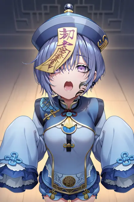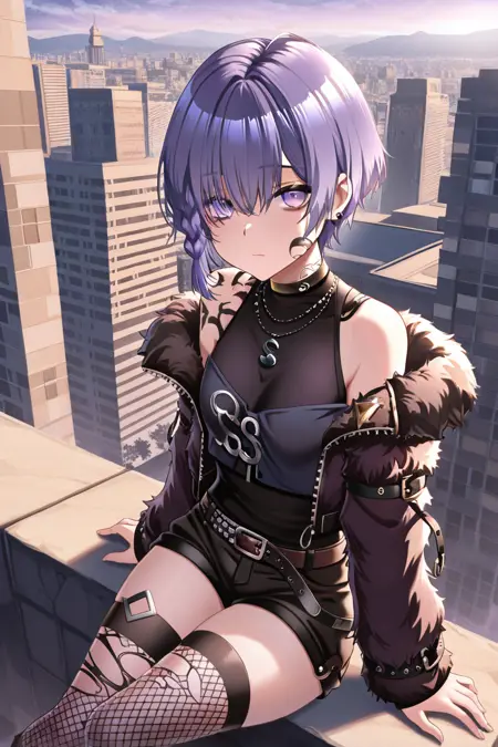 sophia, solo, hood, fishnets, hair over one eye, shorts, 1girl, hood up, horns, blue hair, purple eyes, multicolored hair, looking at viewer, chain, long sleeves, black shorts, fur trim, choker, bangs, belt, fake horns, hoodie, closed mouth, stage outfit