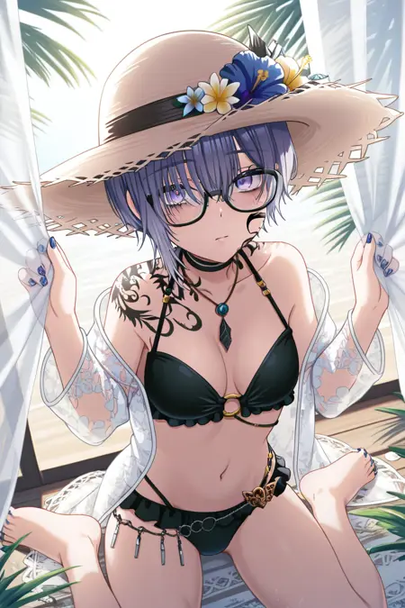 sophia, 1girl, swimsuit, hat, bikini, solo, purple eyes, short hair, breasts, purple hair, o-ring, blush, looking at viewer, black bikini, glasses, black-framed eyewear, navel, jewelry, flower, straw hat, necklace, sun hat, hat flower, choker, o-ring bikini, see-through, bikinisk