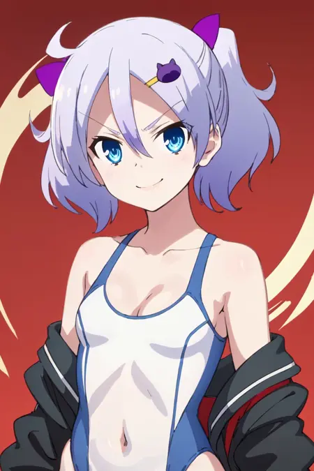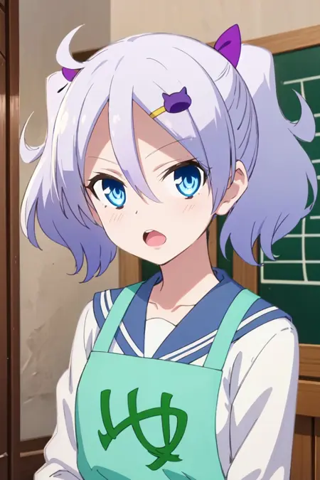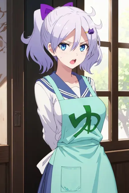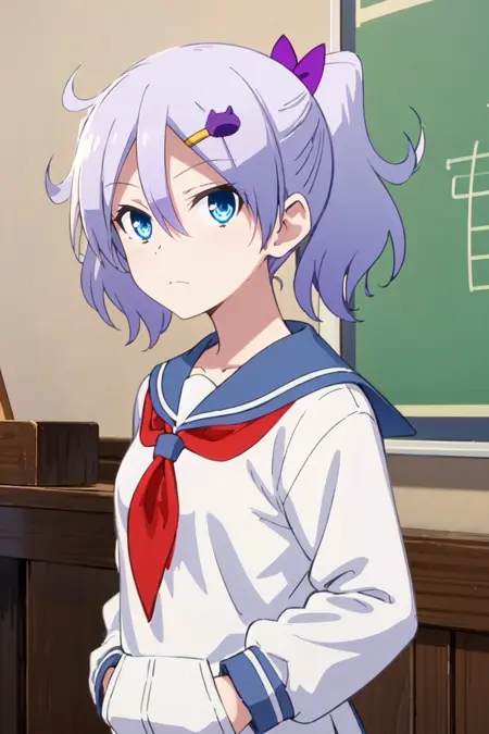 • 要还原她的原装服装,请使用以下标签:pikkykaname, 1girl, solo, looking at viewer, purple hair, twintails, short hair, hair between eyes, ponytail, short twintails, blue eyes, breasts, small breasts, hair ornament, ribbon, school uniform, apron, serafuku, hairclip, long sleeves