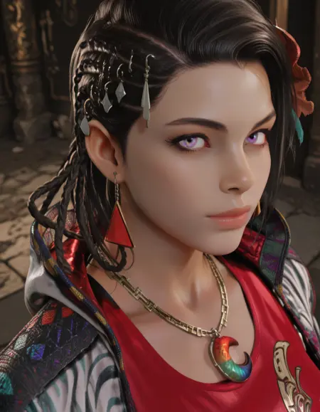 Azucena, brown eyes, or purple eyes, black hair,braids, long hair,