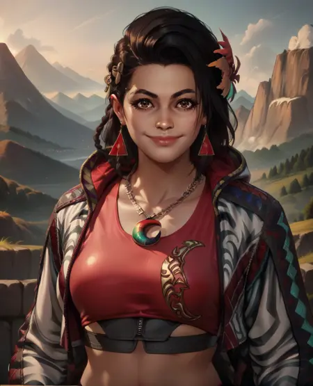 Azucena, brown eyes, or purple eyes, black hair,braids, long hair,