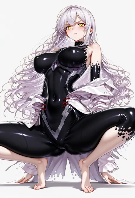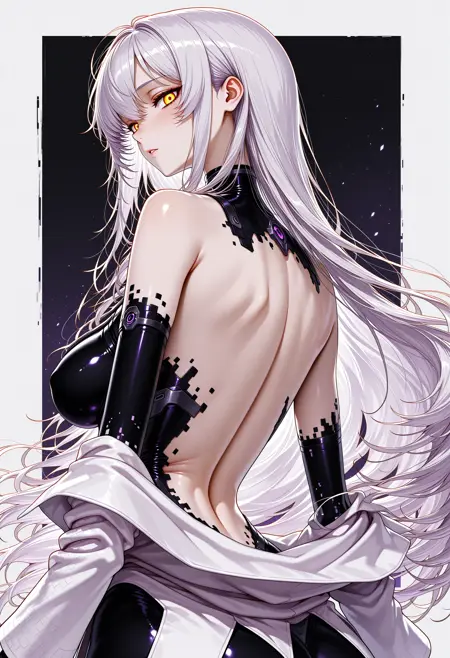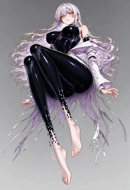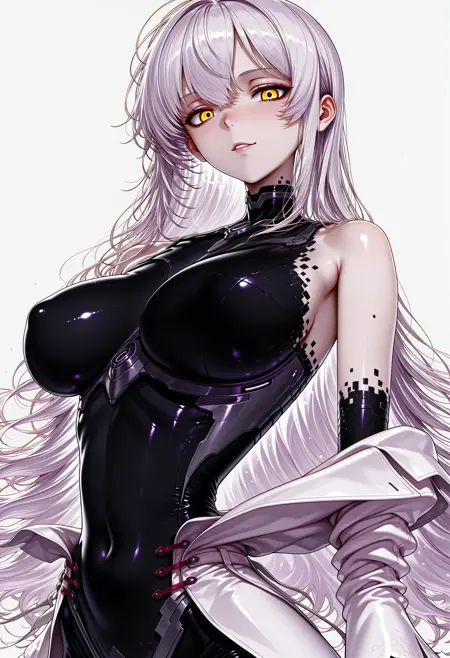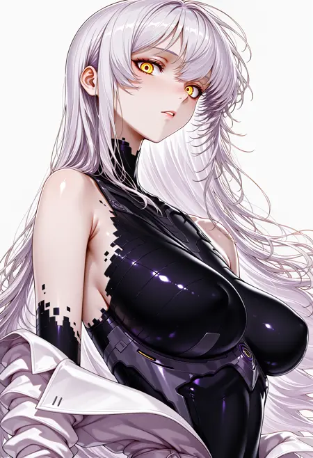 black_bodysuit, bare_shoulder, white jacket, off-shoulder jacket