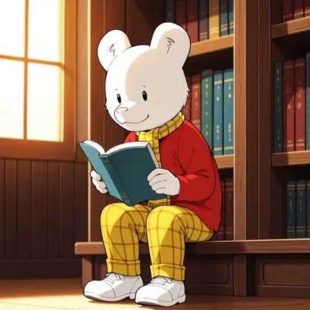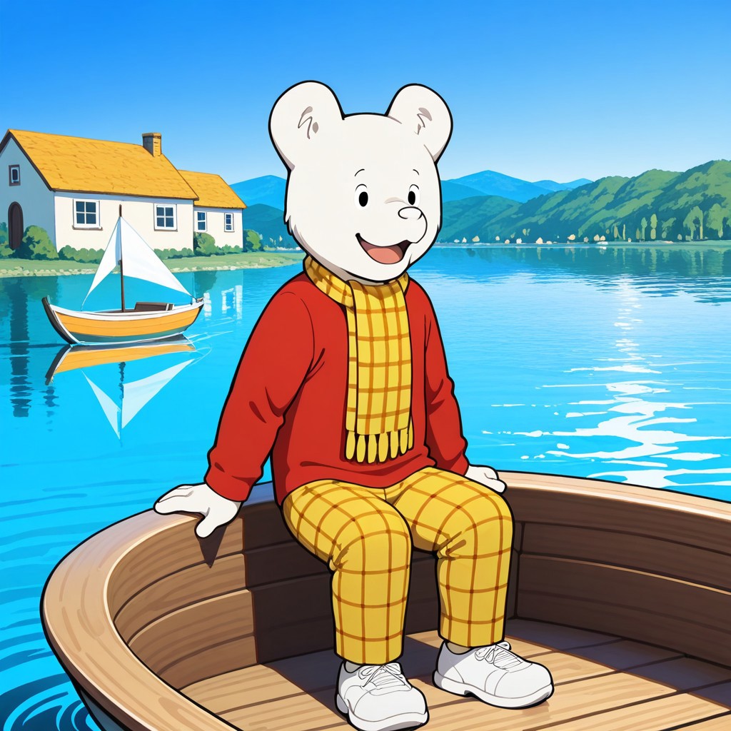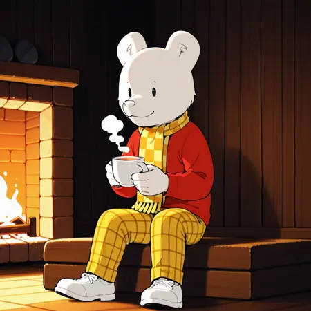 “鲁珀特是一只善良而好奇的白熊,热爱 magical 冒险。他穿着红色毛衣、黄色围巾和格子裤子,以勇敢和温暖的心探索世界。”