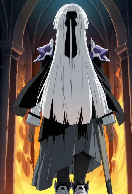 프롬프트: 1소녀, BU_Rapis, 흰색 머리, 파란 눈, 매우 긴 머리, 검은 피부를 가진 여성, 헤드밴드, 보라색 어깨갑옷, 흰색 가슴갑옷, 회색 옷, 검은 망토, 갈색 가죽 벨트, 보라색 벨트, 갈색 칼집, 검은 팬티하이즈, 갑옷 부츠, 흰색 소매 커프스. 공격 중인 모습으로 칼을 들고 있으며, 칼은 벗겨져 있어야 합니다.