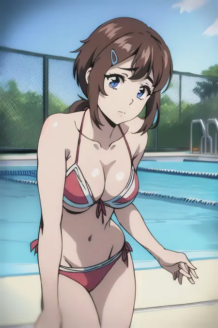외모: 1girl, solo, 갈색 머리, 파란 눈, 가슴, 단발, 앞머리, 큰 가슴, 머리 장신구, 쇄골, 짧은 말발굽, 머리핀