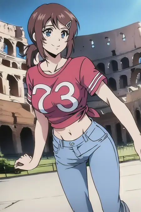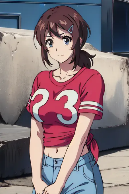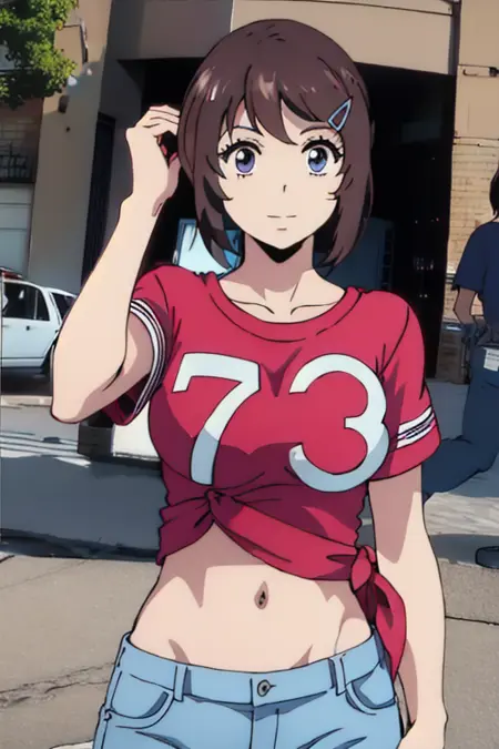 옷차림: 셔츠, 배꼽, 쇄골, 짧은 소매, 머리핀, 허리, 바지, 청바지, 티셔츠, 옷에 쓰인 글자, 청바지, 묶은 셔츠, 크롭드 셔츠, 카프리 바지, 말려 올린 바지