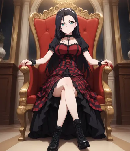 Character: noadefault, black hair, long hair, checkered headband, medium breasts, slender, slim, anime coloring, aqua eyes