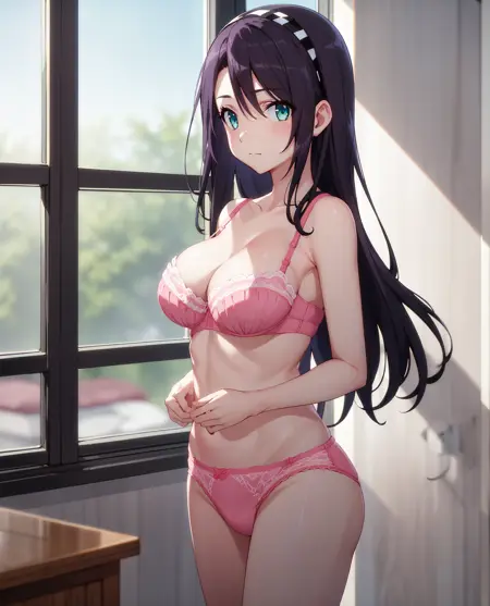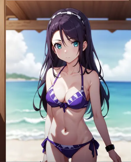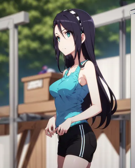 기본 복장에 추가할 수 있는 태그: 긴 머리, 파란 탱크탑, 검은 반바지, 머리띠, 하늘색 눈.