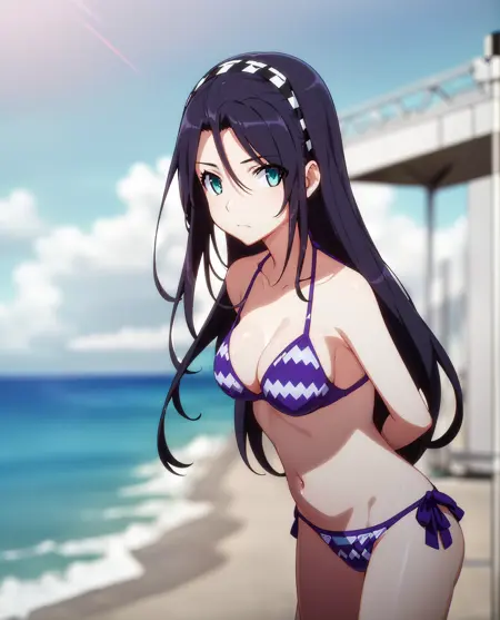 캐릭터: noadefault, 검은 머리, 긴 머리, 체크 무늬 헤드밴드, 중간 크기의 가슴, 마른 체형, 슬림, 애니메이션 컬러링, 하늘색 눈