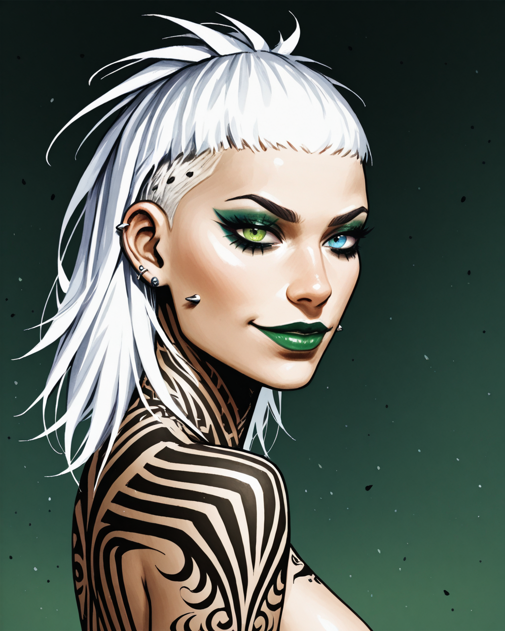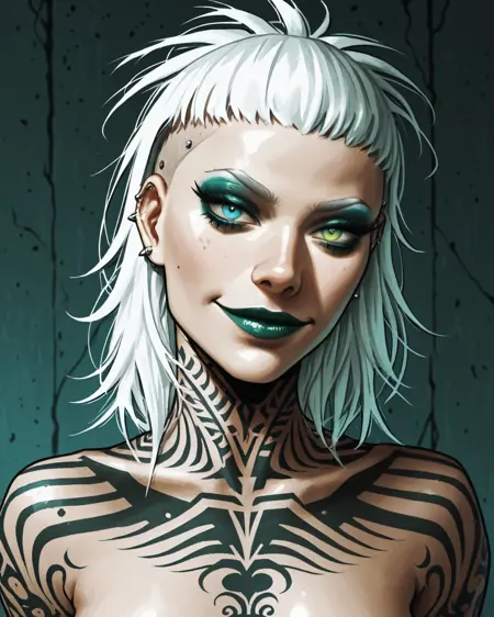 PH34R: ph34r, 흰색 머리, 이종색동안, 파란 눈, 녹색 눈, 벌거벗음, 문신, 메이크업, 피어싱,