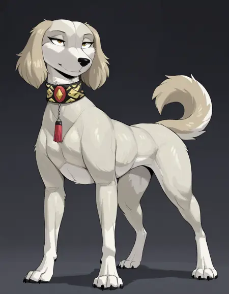 添加 "feral, quadruped, saluki, dog, quadruped, collar, domestic dog, white body" 以获得更好效果