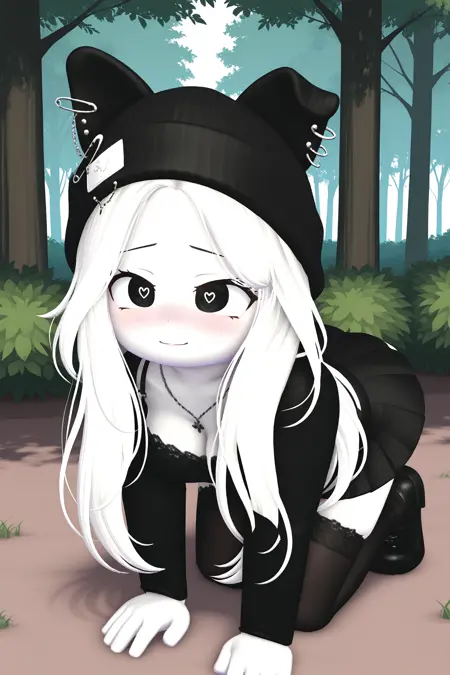 ➜ TheBrayanVTOCILXL, 白い肌, 色付きの肌, 黒い目, ハート型の瞳, 白い髪, 長い髪, 前髪分け, 黒いビーニー, 動物の耳, 黒い耳, 耳が帽子を通して見える, 耳 piercing, 大きな胸, ネックレス, 黒いシャツ, 長い袖, 白いリボン, 黒いスカート, 黒い thighhighs, 黒い靴