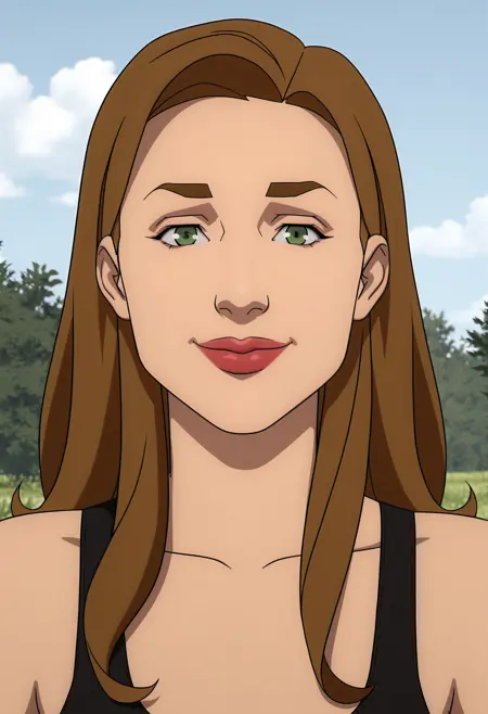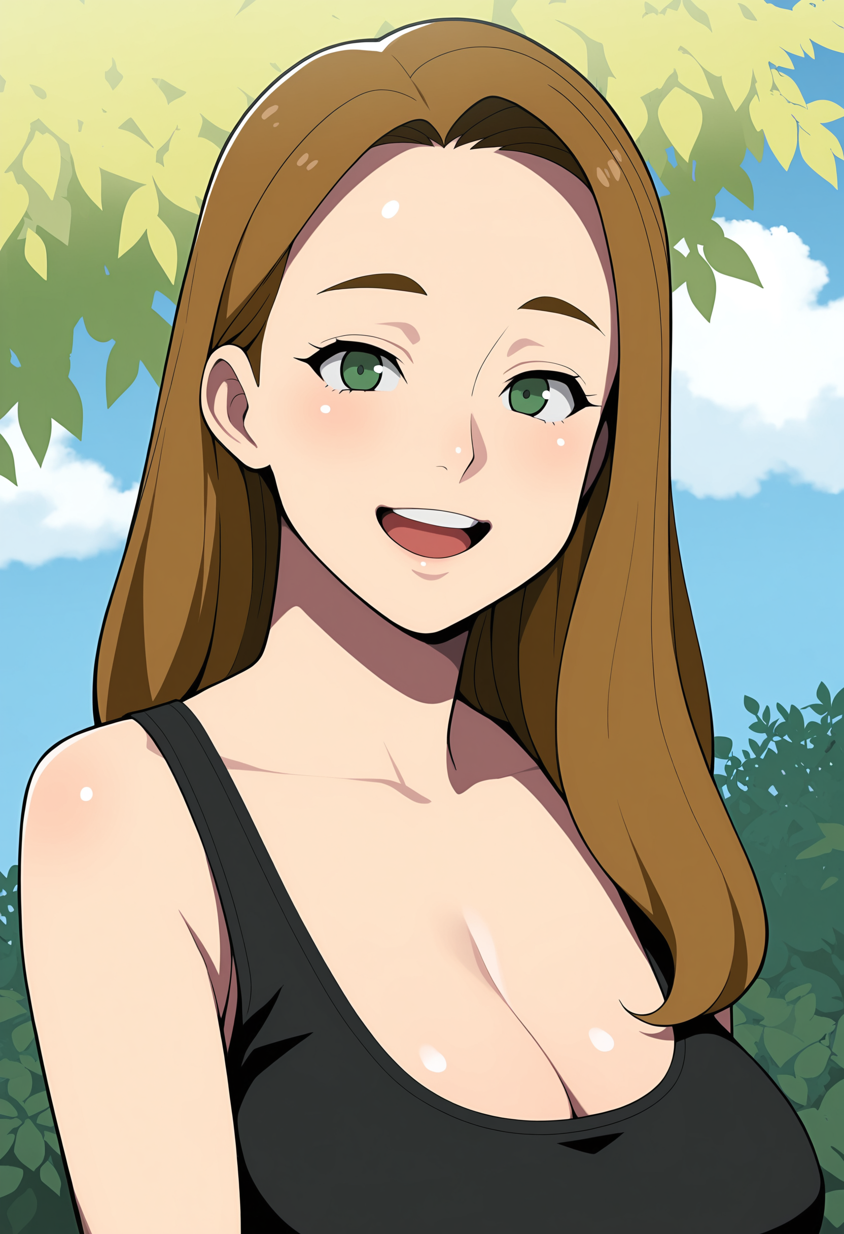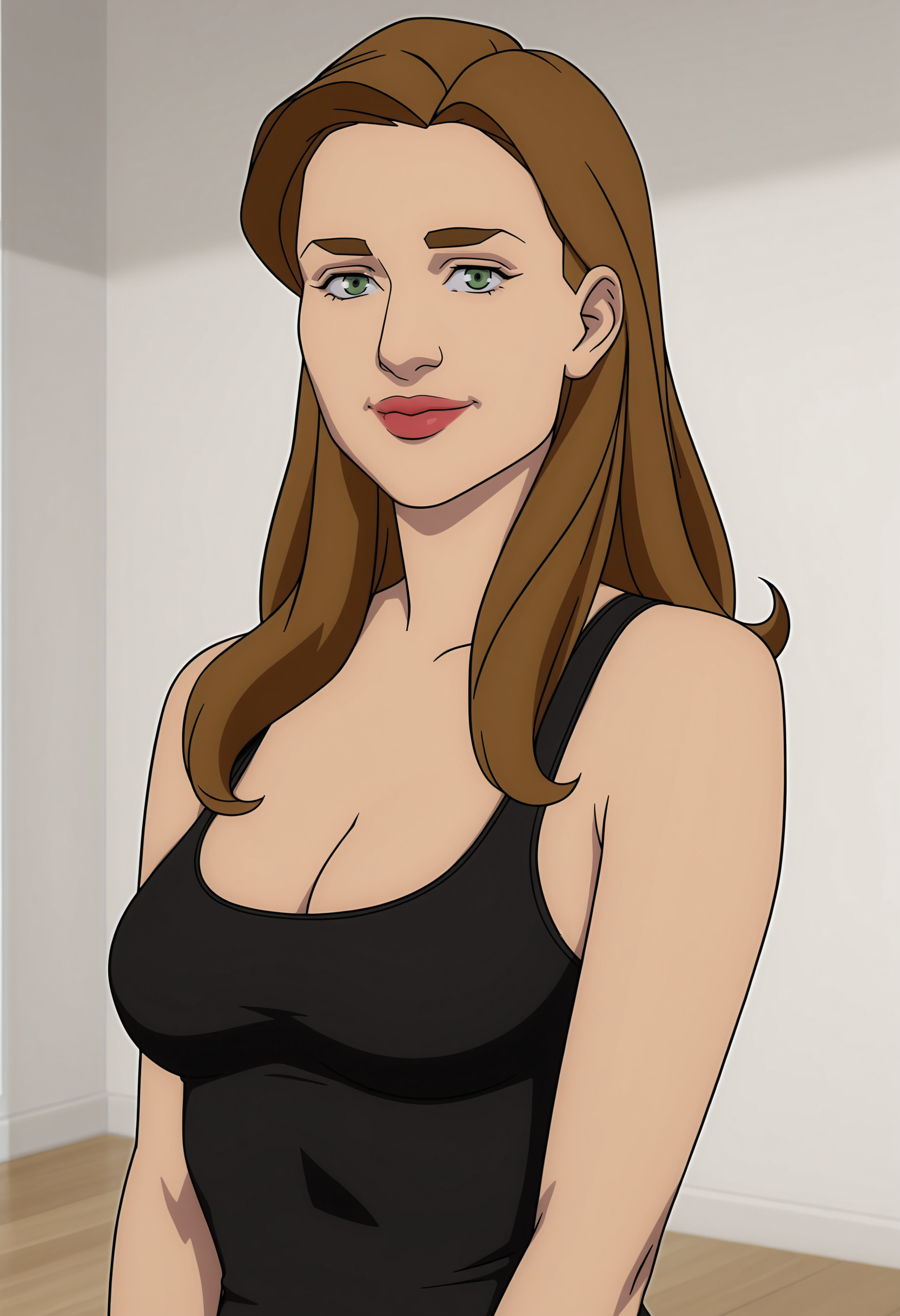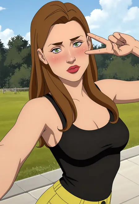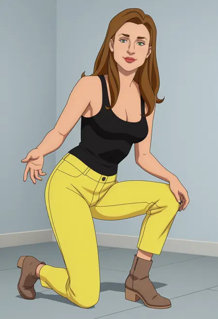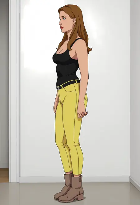 0lilf, 1girl, long hair, brown hair, green eyes, red lips, tank top, breasts, cleavage, pants, boots