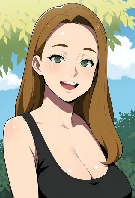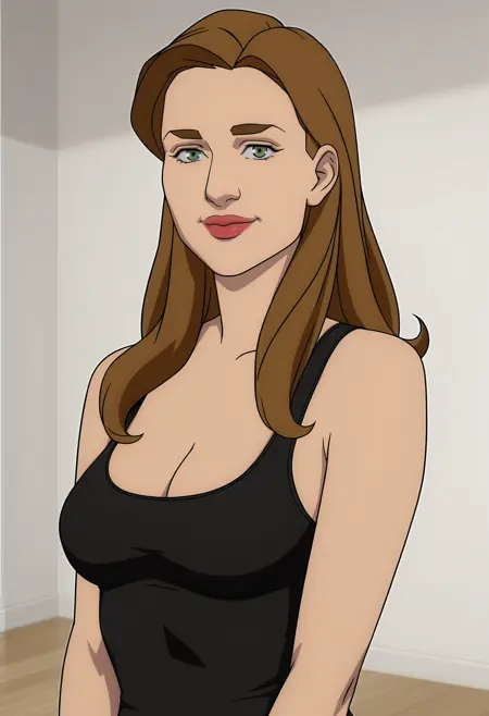 0lilf, 1girl, 长发, 棕发, 绿眼, 红唇, 无袖上衣, 乳房, 挺胸, 裤子, 靴子