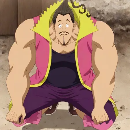 katz, solo, man, black eyes, black hair, black beard, black mustache, muscular build, black sleeveless shirt, long sleeveless vest, high peaked collar, short pants, shoes