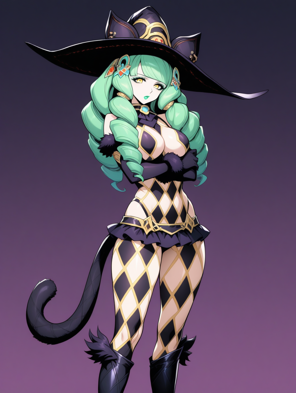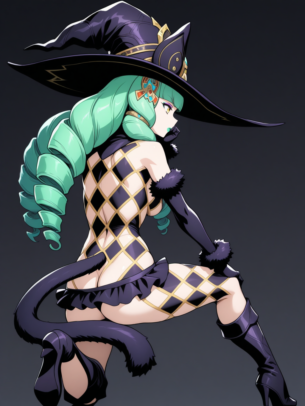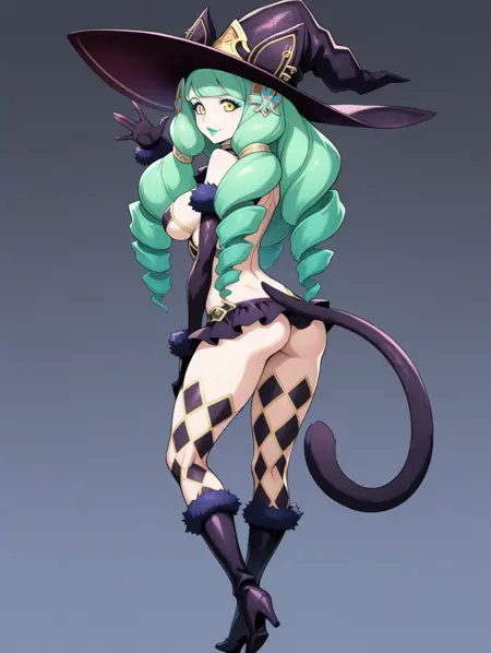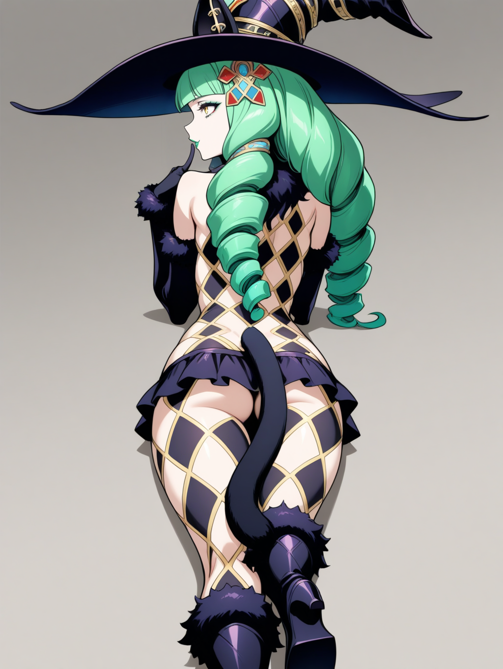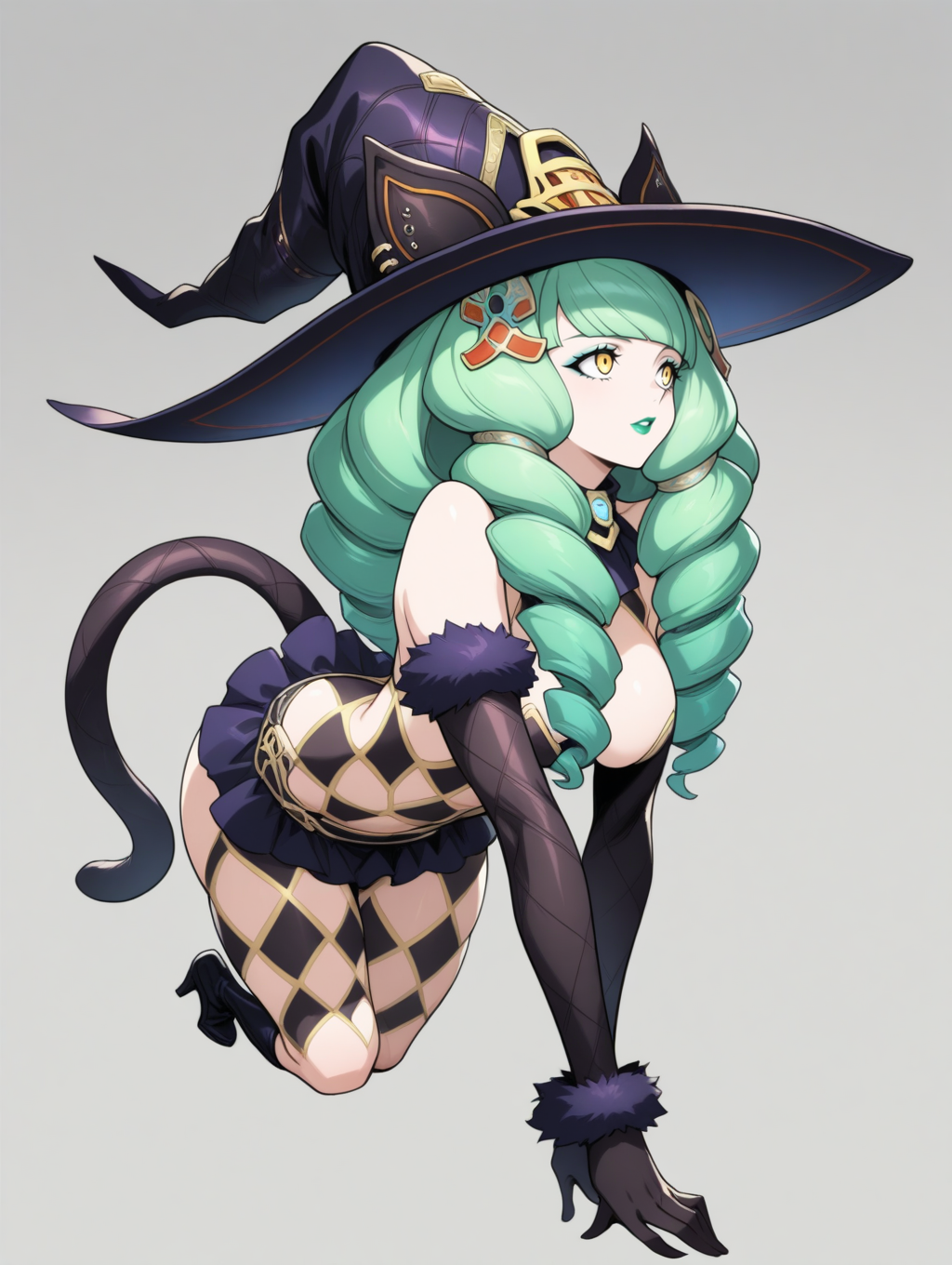 プロンプト例: fiore,緑の髪,黄色い目,緑の唇,ドリル髪,ツインドリル,髪飾り,魔女帽,アーグイル柄服,シングル,化粧,露出の多い服,ハイヒール,黒い肘まで手袋,マイクロスカート,膝上ブーツ,猫の尾,ファー trimming 手袋,アーグイル柄の脚部装備,