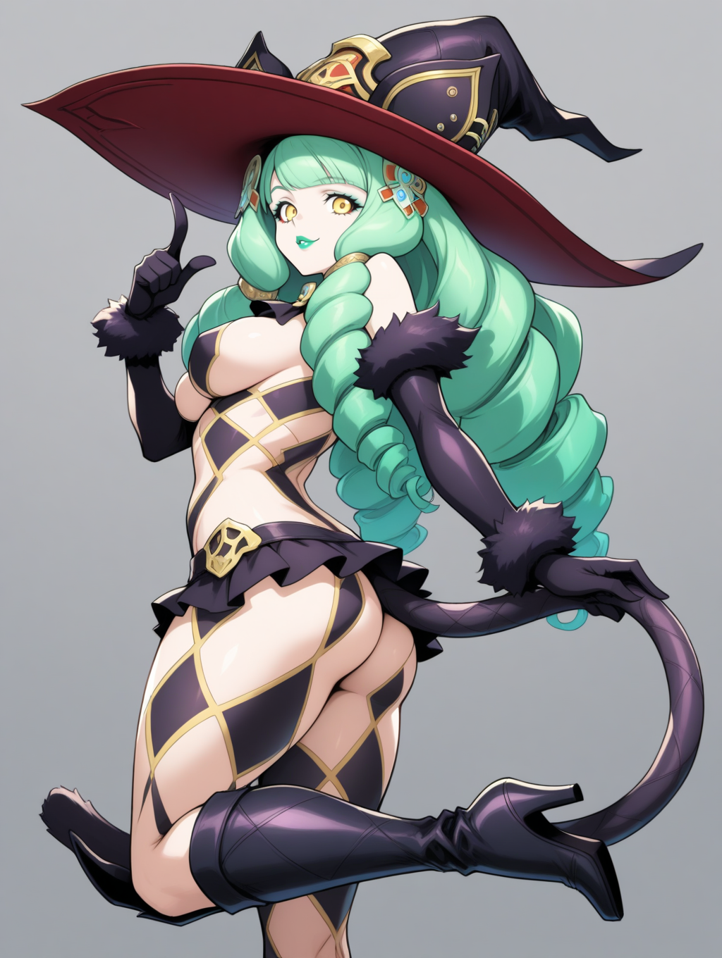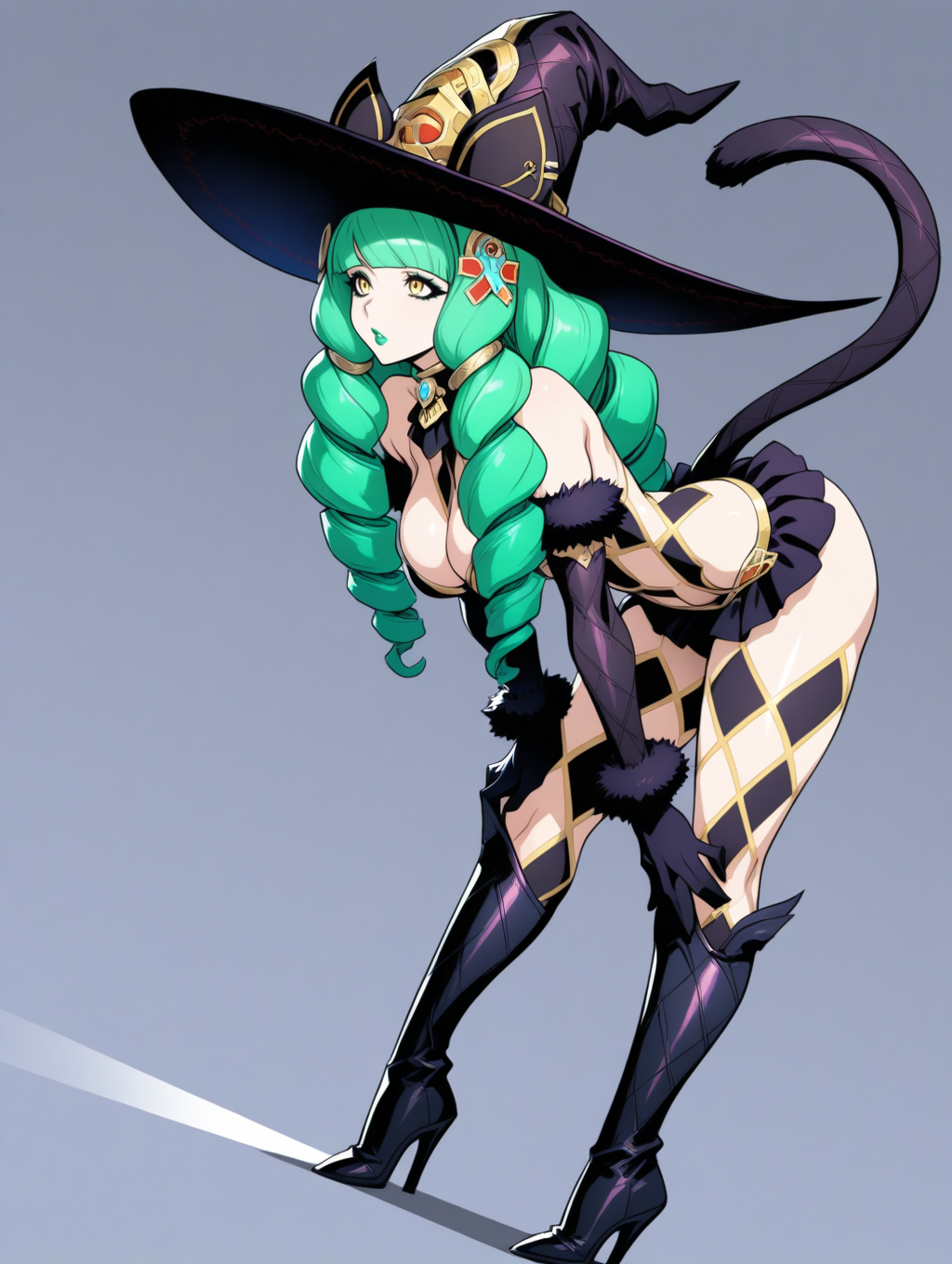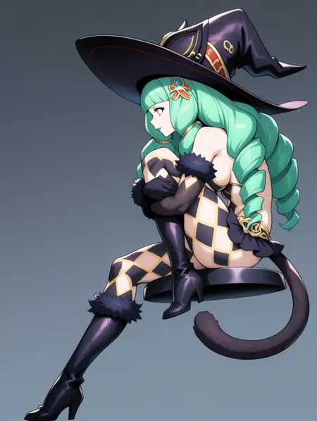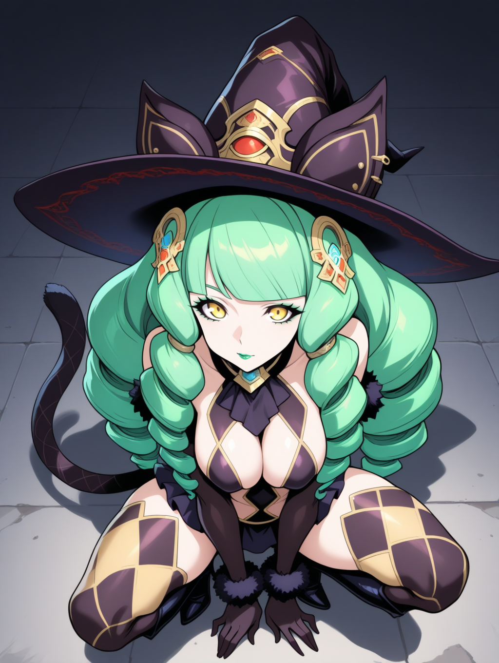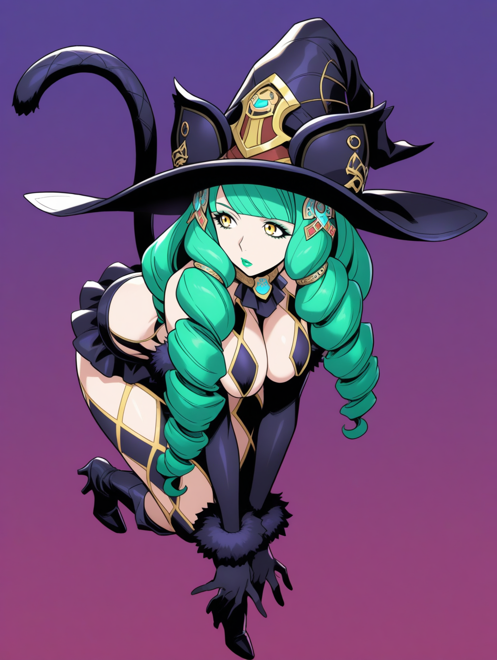 プロンプト例: fiore,緑の髪,黄色い目,緑の唇,ドリル髪,ツインドリル,髪飾り,魔女帽,アーグイル柄服,シングル,化粧,露出の多い服,ハイヒール,黒い肘まで手袋,マイクロスカート,膝上ブーツ,猫の尾,ファー trimming 手袋,アーグイル柄の脚部装備,