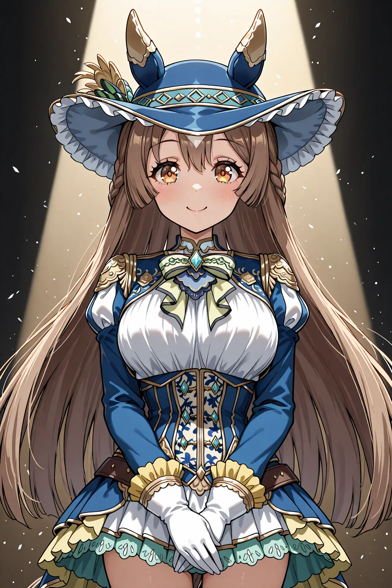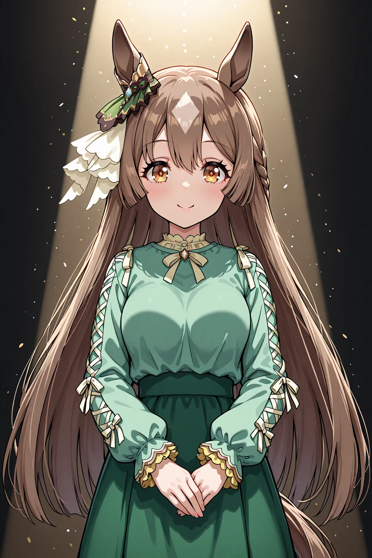 말 귀, 말 꼬리, 말 소녀, 귀 장신구, 긴 머리, 갈색 머리, 반올림, (매우 긴 머리), 눈 사이의 머리카락, 땋은 머리, 앞머리, 갈색 눈,