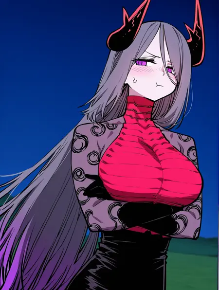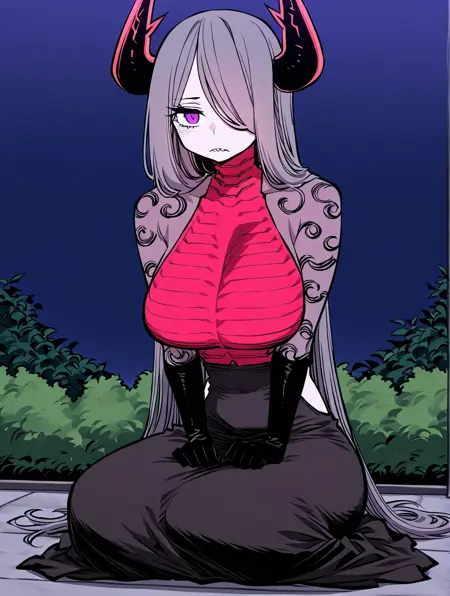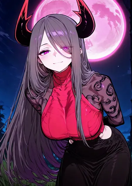 | トレーニングワード | 1girl, solo, long hair, straight hair, gradient hair, grey hair, purple hair, bangs, hair covering one eye, horns, black horns, red horn tips, demon horns, purple eyes, sharp teeth, コピーしました! sleeveless top, high collar, tight top, red top, black gloves, elbow gloves, black skirt, long skirt, bodycon skirt, covered shoulders, semi-transparent sleeves, patterned sleeves, swirl pattern, spiral pattern,コピーしました! |
